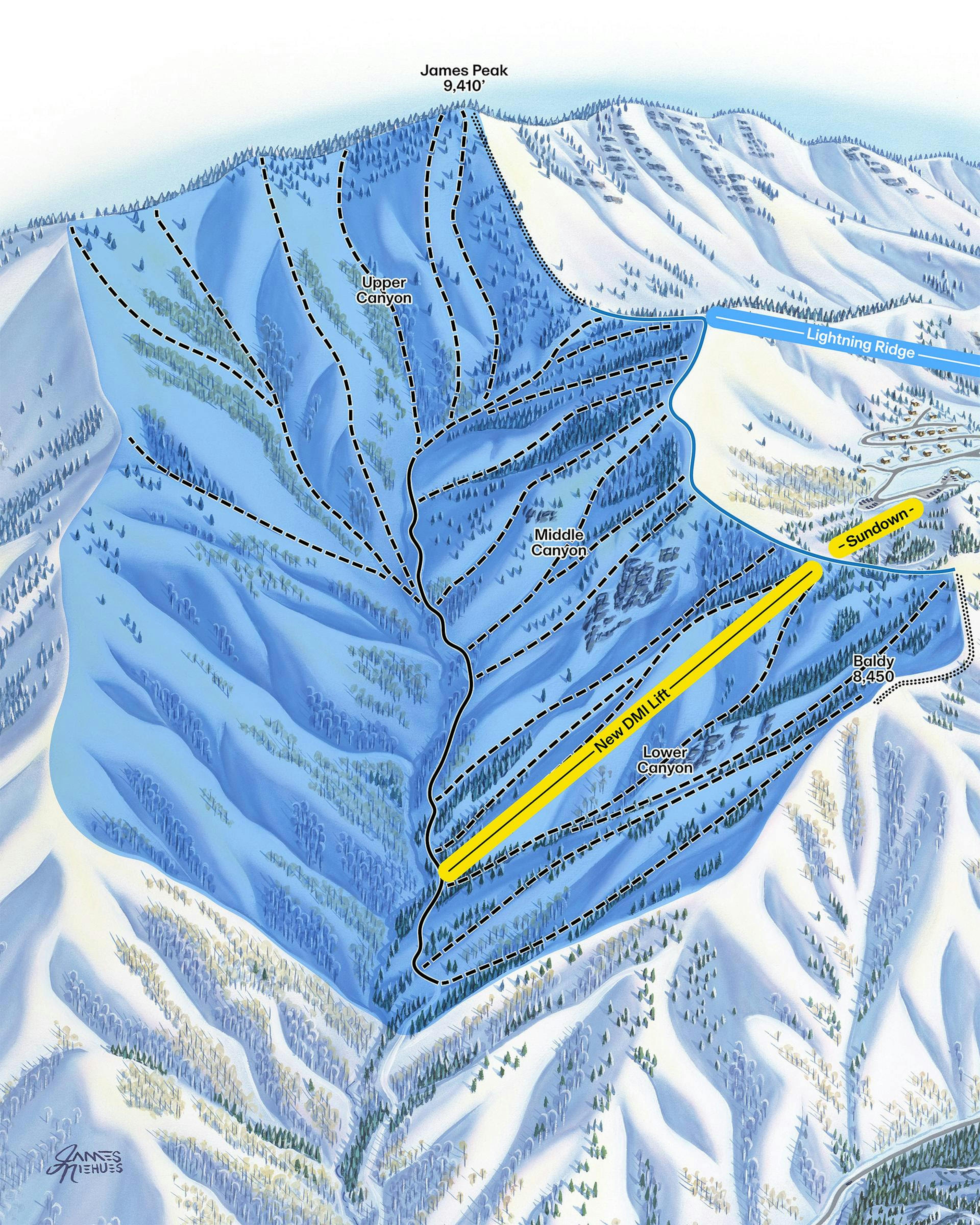 Open glades, narrow chutes, and techy lines of DMI will be lift-accessible next season. The brand new fixed-grip triple will open 1,000+ acres and 2,200 feet of vertical terrain previously accessible only through guided backcountry tours. With more than 25 distinct routes through one of the most extreme areas on the mountain, this eastern zone beneath James Peak rewards the bold.